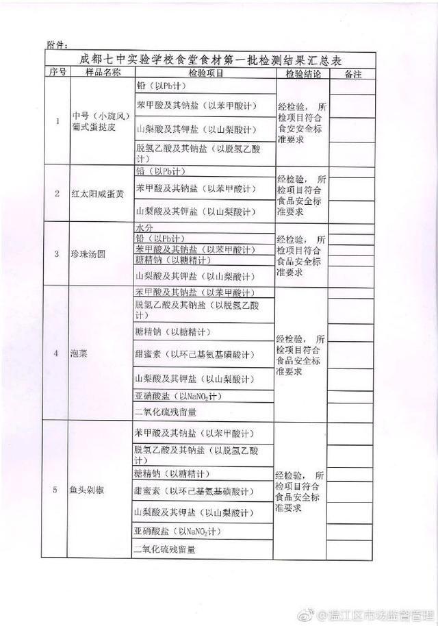 四川發(fā)布客戶端消息 今天下午,溫江區(qū)市場監(jiān)督管理局官微@溫江區(qū)市場監(jiān)督管理 發(fā)布關于成都七中實驗學校食堂食材第一批檢測結(jié)果的通報。通報中表示,所取樣品均在保質(zhì)期內(nèi)。