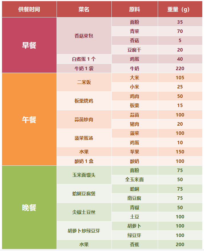 在配餐和烹飪方面,制定合理團(tuán)餐膳食配餐計(jì)劃。食物種類要符合《中國居民膳食指南》的推薦要求,優(yōu)先采用減少營養(yǎng)成分損失和保持自然風(fēng)味的食物烹飪方法,少用炸、煎、熏、烤等。每一餐食譜中提供至少3類食物,同類食物之間可進(jìn)行品種互換(見表格)。