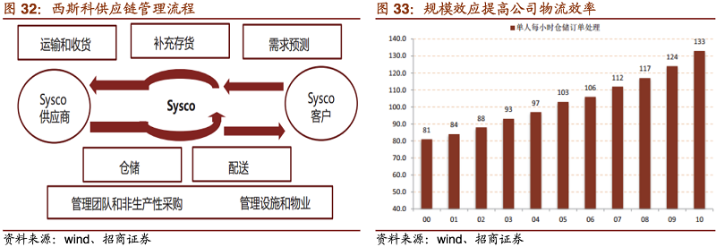 其四,SYSCO有強大的供應鏈管理能力,保證物流效率。配送中心數量多,通過規(guī)模效應降低了人力和物流成本,基本上是用ERP系統(tǒng)開展業(yè)務。產品十分豐富,可做到一站式服務,同時涉獵食品和非食品,公司通過專業(yè)營銷與執(zhí)行,提升對客戶的滲透率與服務黏性。SYSCO銷售的毛利率基本上做到了18.7%,銷售凈利潤率做到了百分之二點多。