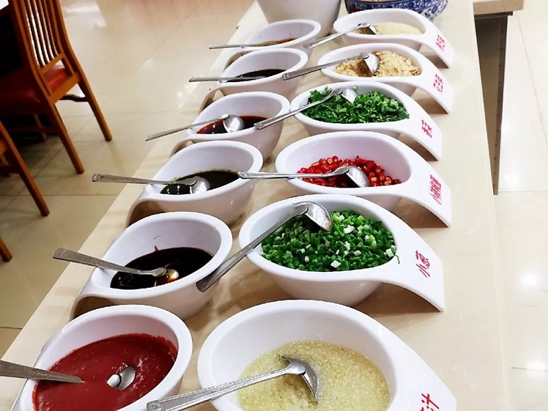 有特色涼面及水餃,也有拉面,澆頭則可自助式的選擇西紅柿雞蛋、酸菜肉絲、茄丁、炸醬等6種。