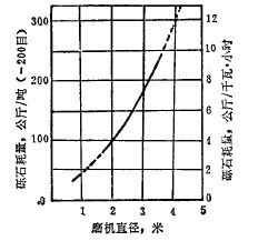 抗磨性和沖擊強度差的礦石,自然會使礫介的消耗量大,并在一定的情況下,可能使第二段礫磨成為不可能。礫介的粒級愈粗,礫介的消耗量愈大。如某礦首段礫磨機的礫介粒度為80~250毫米時,礫介的消耗量為47公斤/千瓦時;而在第二段礫磨機的礫介粒度為40~80毫米時,礫石耗量為17公斤/千瓦時。磨礦濃度愈低,礫介間的接觸愈多,礫介磨損也愈快。尤其值得注意的是,礫介的消耗隨磨機直徑的加大而迅速增加,如圖3-3-16所示,礫石耗量是磨機直徑的函數,當磨機直徑增加50%時,礫石的消耗量加倍。此外,礫介的消耗量隨磨機轉速率的增加而增加。提升襯板越高,礫介耗量也越大。如有一硫化礦的第二礫磨,裝有80毫米高的新橡膠提升板,與低波紋形剖面已磨損的襯板相比,前者的礫石耗量為后者的兩倍。