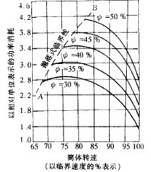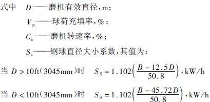 由公式(5-40)和&5=Ss值看出,每噸大球的輸入功率比小球的大。筆者的工業(yè)試驗證實,球徑減小后磨機功率可下降2%~3%。